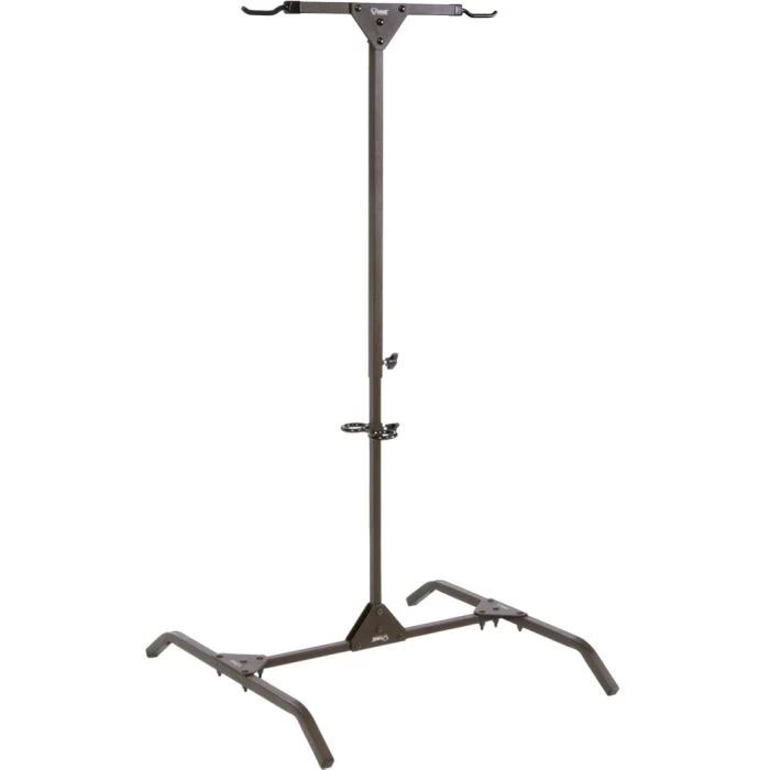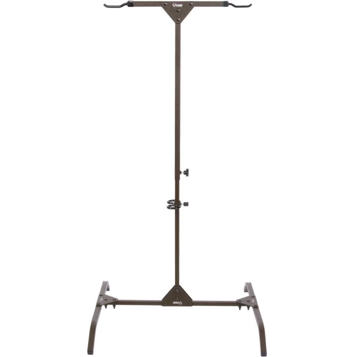 The Archer’s Hard Surface Practice Hanger provides everything the archer needs to make their practicing as enjoyable as possible. Its sturdy, lightweight, mobile design is perfect for indoor or outdoor archery ranges or backyard practicing. It has a hanger on each end for one- or two-person use and includes an adjustable arrow-holding ring that will easily hold six arrows. Bow hanger telescopes and locks in the extended position and is long enough to work on the older or longer compound bows. When using outside the raised leg design will allow the user to place on uneven ground. Durable olive powder coat finish.