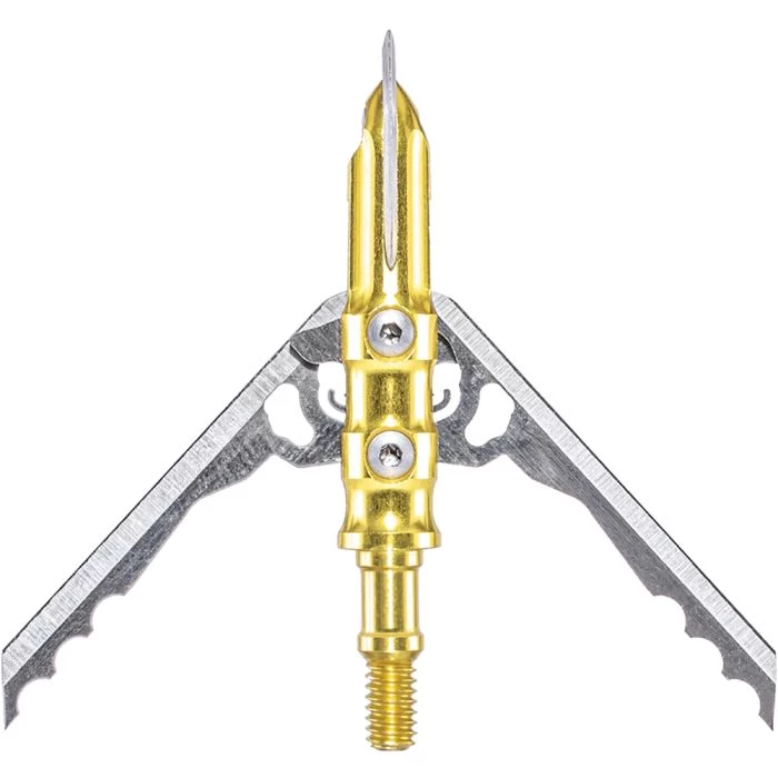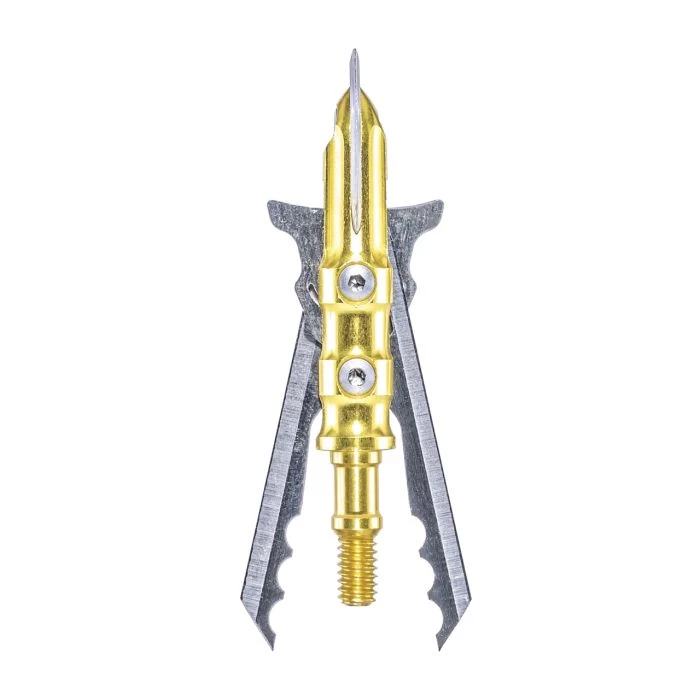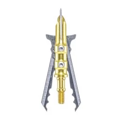 The redesigned X-Treme, now with the exclusive NC (No Collar) blade retention system eliminates the need for a SHOCK COLLARβ’, dental band or O-ring. Taking verse from the original X-Treme, the new-for-2020 two-blade design is centered around a 1.425″ long high-strength 6061-T6 aircraft grade aluminum ferrule whose two 0.039″ THK blades instantly deploy to an enormous 2.3″ upon impact. Available in two new 100-grain versions that bolster either a cut-on-contact leading-blade tip or a bone-crushing chisel tip, fans of the X-Treme will find the performance they command in these great heads.